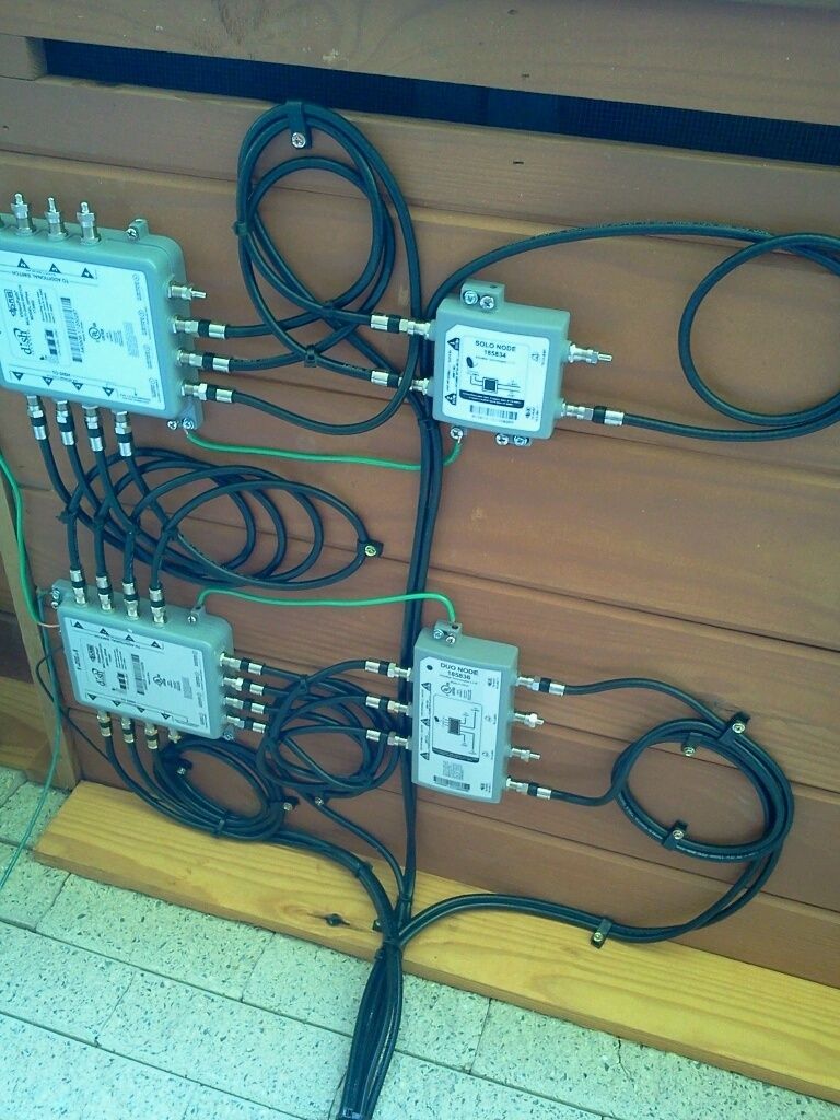 Just spent about 5 hours setting up this system it was a custom work order thru dish. i sat around debating on how i was going to do it at first debating on 2 dish solution or switches. ended up using 2 dp44 switches ran 2 lines inside for the power inserters and all the lines for the nodes off the switches and then wired the hoppers and joeys. used a solo and duo node duo ran the main rooms of the house with 2 hoppers and 4 joeys and the solo ran the office and 2 guest rooms this was what it looked like before i got the joeys wired. anyone else done a hopper system like this?