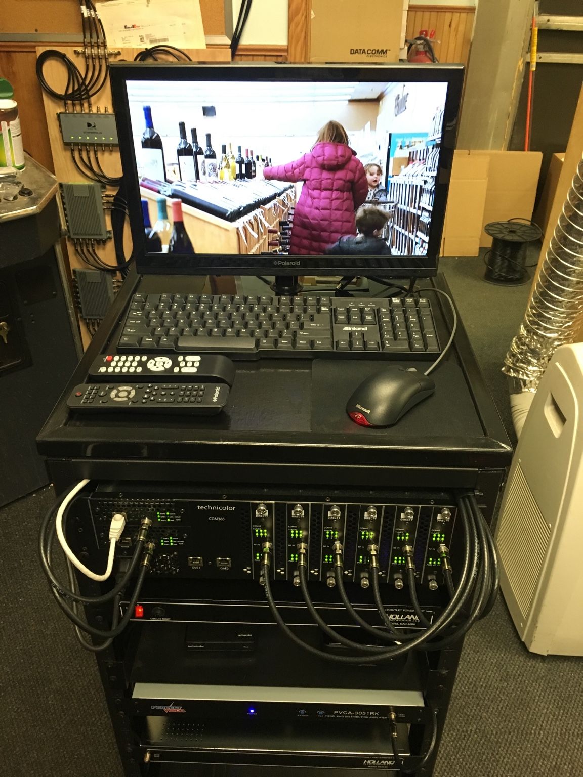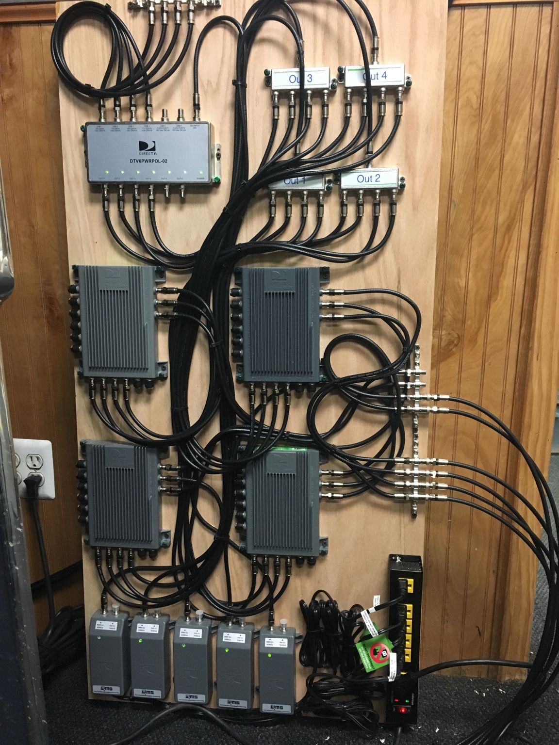 A fifth coax line from the linear LNB on the 95W dish to one of the two available available flexport connectors on the DTV6PWRPOL-02 polarity locker. Then the output from that unit to another 1 x 4 splitter (for a total of five now mounted on that board) to feed one of the flexports on each of the four SWiM-16s