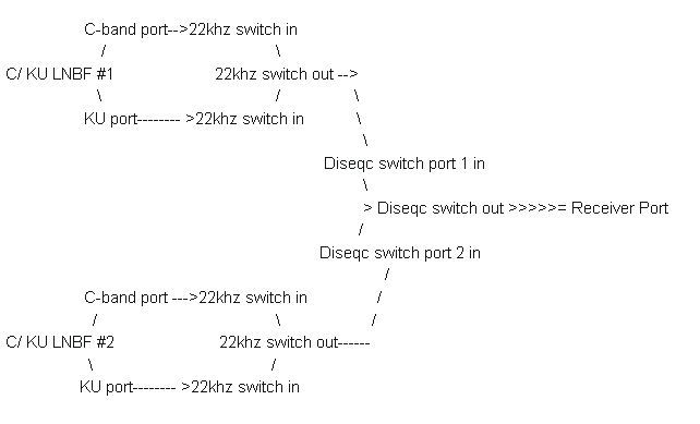 I'm up and running with the following setup (below) using 2 C/KU combo lnbf's and two new Ecoda 22khz switches connected to one 1x4 diseqc switch. One lnbf has a dialectic plate to pick up circular signals while the other does not which allows for maximum signal pickup for hard to tune satellite in signals. The problem I'm having now is with the dish actuator motor arm that appears to be affected by the cold. Once I move the dish past 45.7 east it gets stuck and I cannot get it to go back west unless I go out to the dish and force it. Once this happens the satellite dish position are off and I need to re-aim the whole arc again. Maybe I will look into a stronger dish actuator motor instead of the cheap $70.00 version I got off ebay. (Edit) On my receiver I changed the settings for C-band to use 22khz off and for KU band I changed the 22khz setting to on as well as changing the port for the 1.0 diseqc setting.