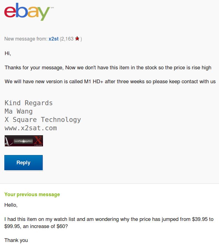Well, X2 has come out with the plus model (M1HD+) and the price is back down to $39.45. Instead of starting a new listing it seems they just renamed the old one. By looking at the listing I don't see any difference in appearance or features from the previous model. Guess the changes are internal - hopefully better heat management.Being a little PO'ed at this I contacted X2 via eBay yesterday to see what they would say regarding why the price had gone up so high. I figured I would not get a reply. I checked my messages this morning and I actually did get one the same day. Here is what they said: