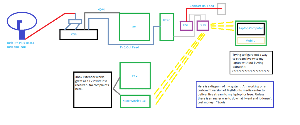 So far, I have connected my 722K to my HDTV with HDMI and my HTPC from TV 2 Coax out. My modem and router are also at TV one with HTPC and 722K wired with broadband. Because of my outlet limitations I have chosen to broadcast TV2 through MCE via my wireless N 5Ghz router to my Xbox360 Extender. ( I tried to run both tv 2 and HSI on the same coax outlet with dual splitter config but it doesn't work). Am nonplussed with the extenders picture quality as a direct tv2 connection was at least close to 720p and the MCE DVR buffer blows dongle. Now here is the kicker, still don't have a solution for broadcasting to my laptop in the kitchen. This is where Mythbuntu comes in. I have read online that others have managed to stream live tv through Myth to a laptop client on LAN only. Right now my myth conundrum is that I only want to run Mythbuntu as virtual machine with windows as host os. Under virtual box, I haven't found a way to make Mythbuntu see my usb tuner YET. Will post updates as I make headway. Does anyone else have any alternative suggestions?