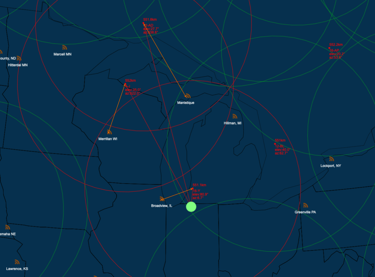 So, assume 550 km up and 550 km away, that's roughly 778 km, or 777,817 meters. Light travels 300,000,000 m/s in a vacuum, so the travel time up and assuming a similar situation for the trip down, yields a little over 5 ms for the outbound leg, maybe adding 1 ms for internal processing time in the satellite. So, Starlink could add just under 15 ms to the "normal" terrestrial Internet travel time. My attached example doesn't attempt to figure out the actual distances involved at this moment in time where I had three possible paths to the Internet backbone. If I were attempting to connect to my work system, the additional travel would pretty much be the distance up (550 km), the distance down (550 km), and the backbone time from Broadville, IL to our Corporate datacenter near Chicago. But, that would be the best case, and it would probably jump up another 15 ms if my Starlink used the Wi or MI ground stations.