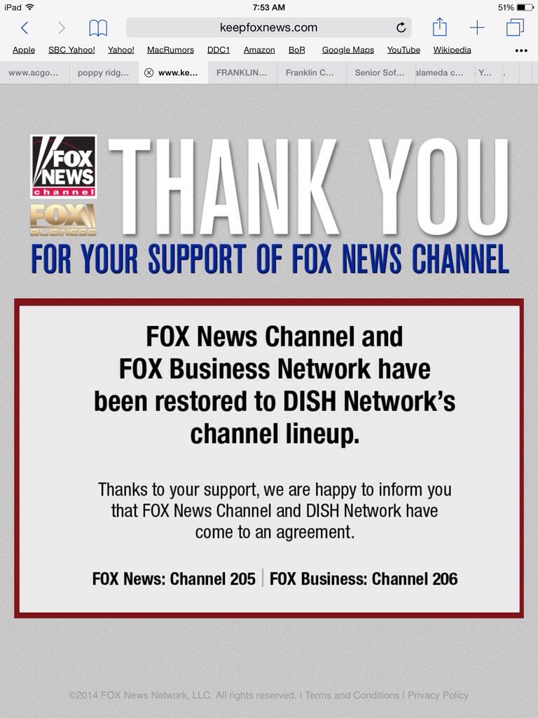 The problem is not the renewal rate for Fox News and Fox Business. That rate was pretty much agreed upon, or close. The sticking point, is that Fox wants to add the other channels, like Fox Sports 1 and one other one (FXX, right?) to the discussion, and there is still a contract on that.