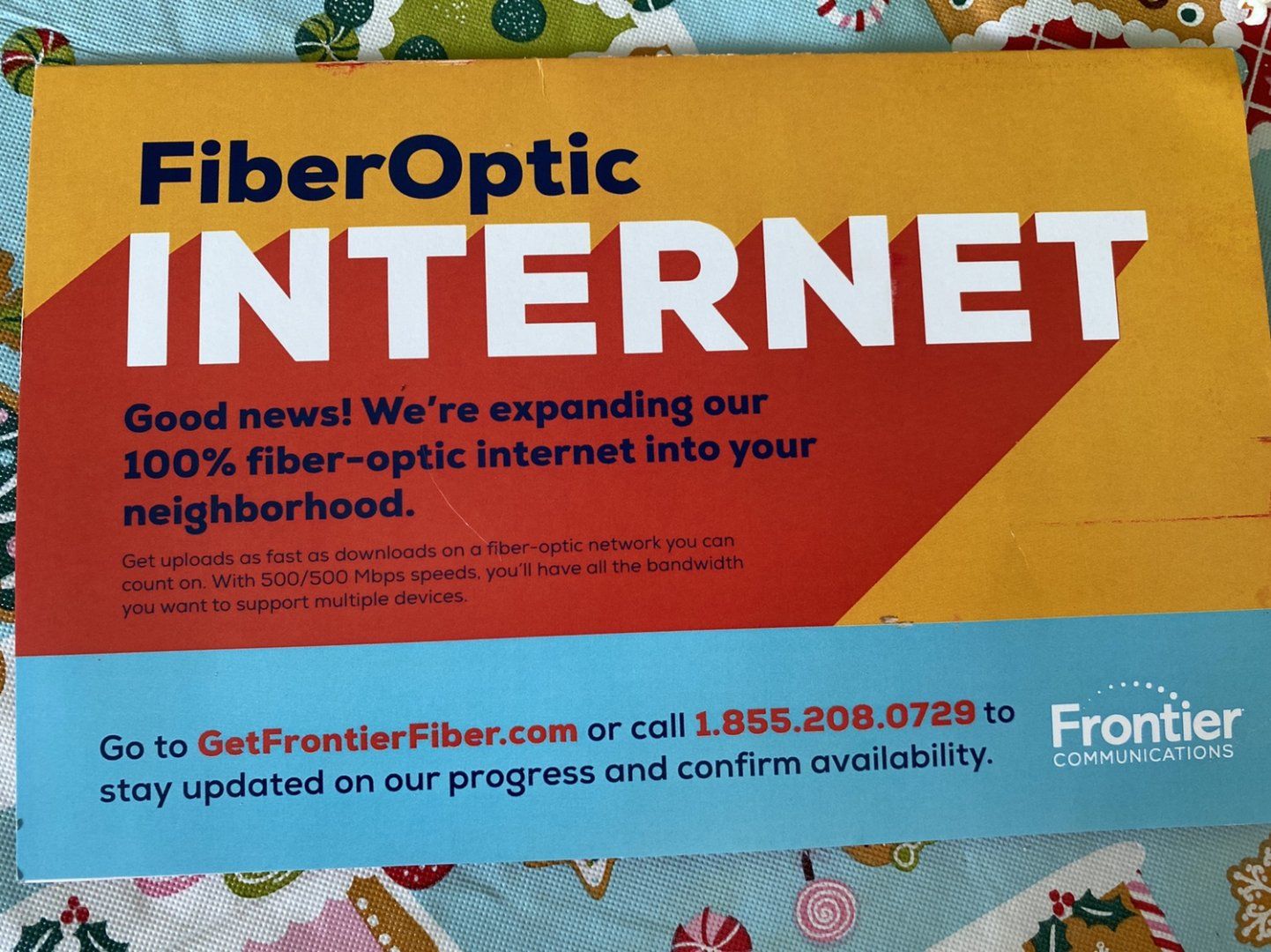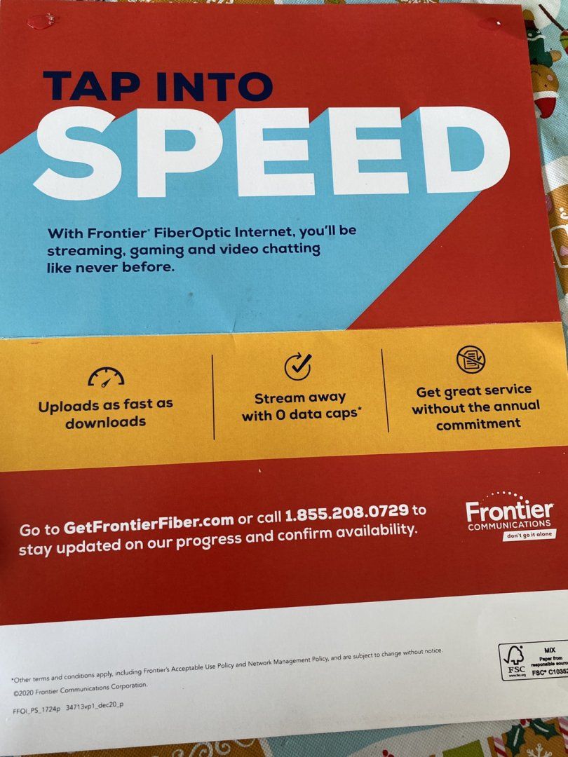 On Friday they setup a table at the end of the street try to sell their fiber service. I felt sorry for them as everyone in ow has already switched to GoNetSpeed and loves it. And unlike Frontier you are locked in at your price for life.