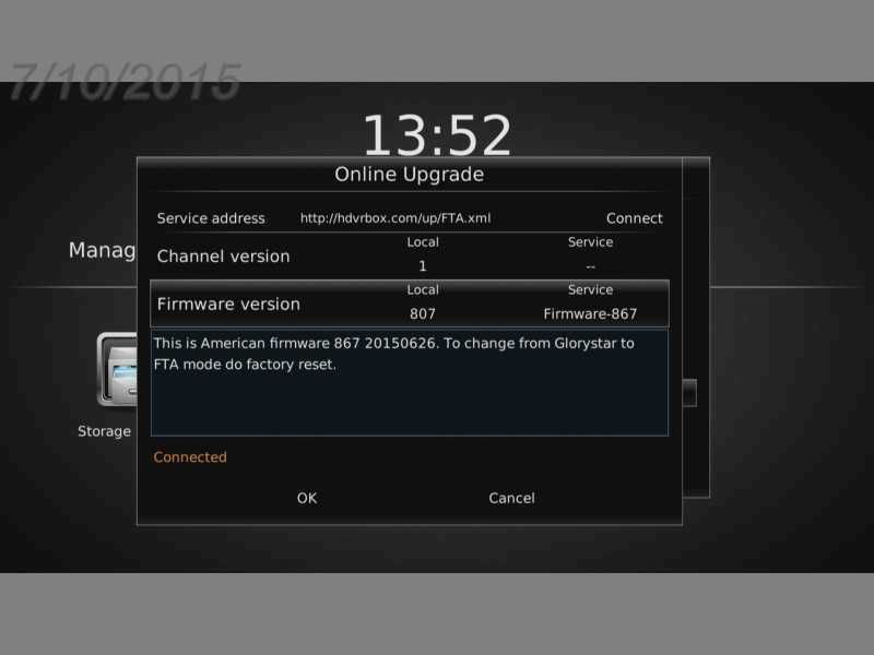 The satellite installation was simple and the menus feel familiar. The first screen has the user select the location and city for time zone. Next screen gave the option of selecting FTA or the Glorystar mode. North American satellite list is preloaded and are separated by C and KU bands. Supports 22KHz, DiSEqC 1.0/1.1/1.2 and USALS.