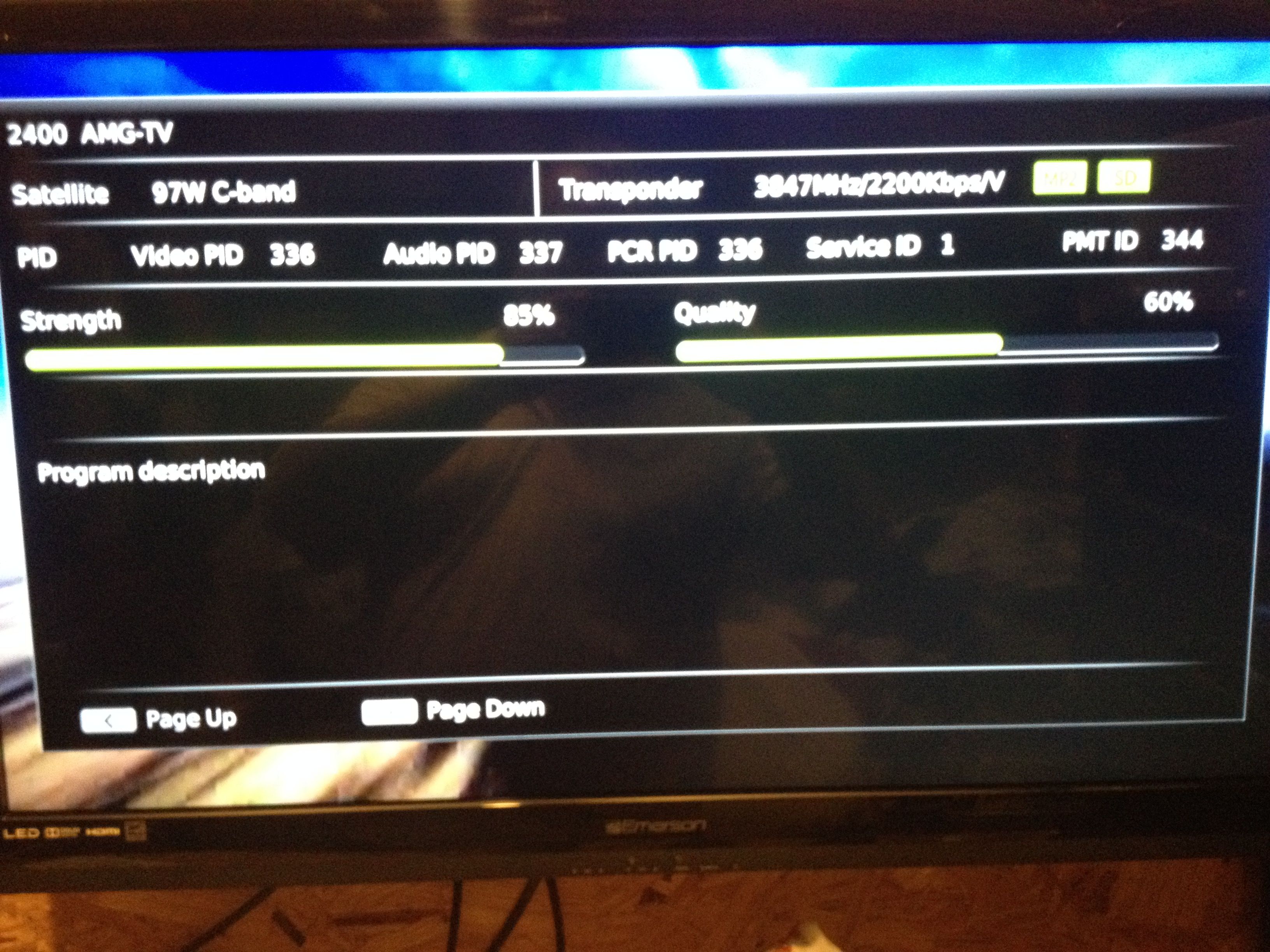 Not bad for a small dish. It is marked on the back: Channel Master, Part No. 3040865, Mold No. 1x0.7-1, Made In The USA. 85% Strength, 60% Quality on AMG-TV, that seems to be the strongest transponder. 3847MHz V 2200Kbps is what it scanned in as. Video Pid 336, Audio PID 337, PCR PID 336, Service ID 1, PMT ID 344.
