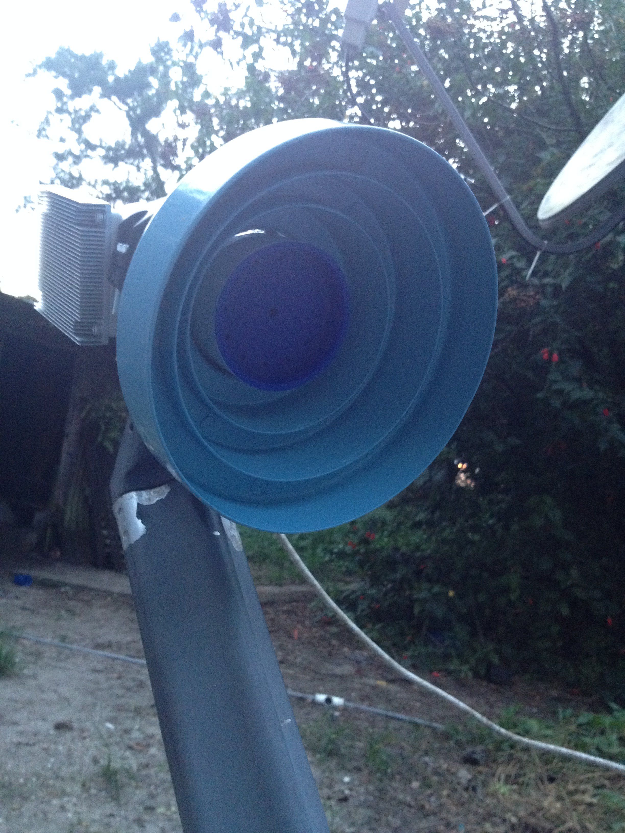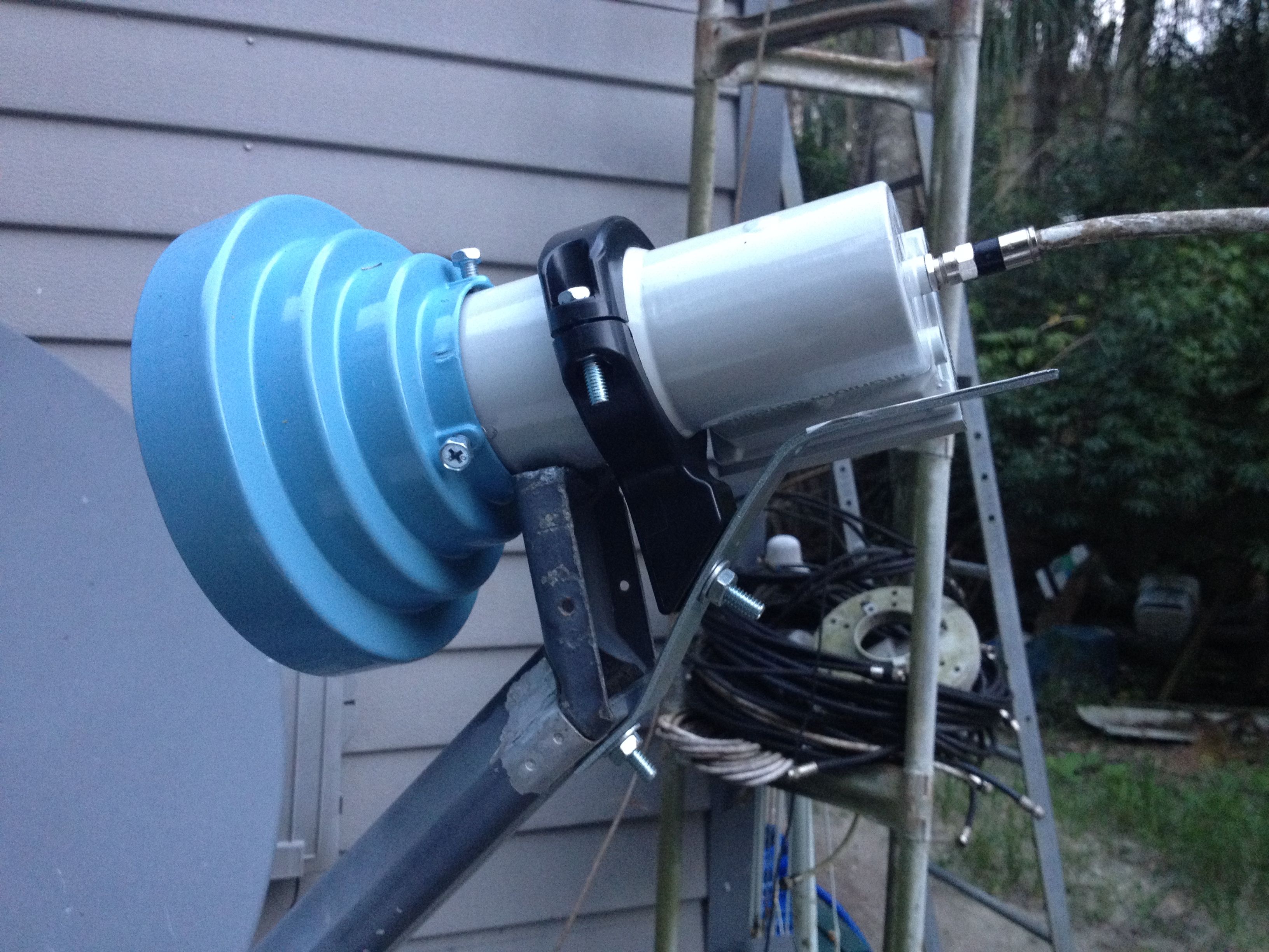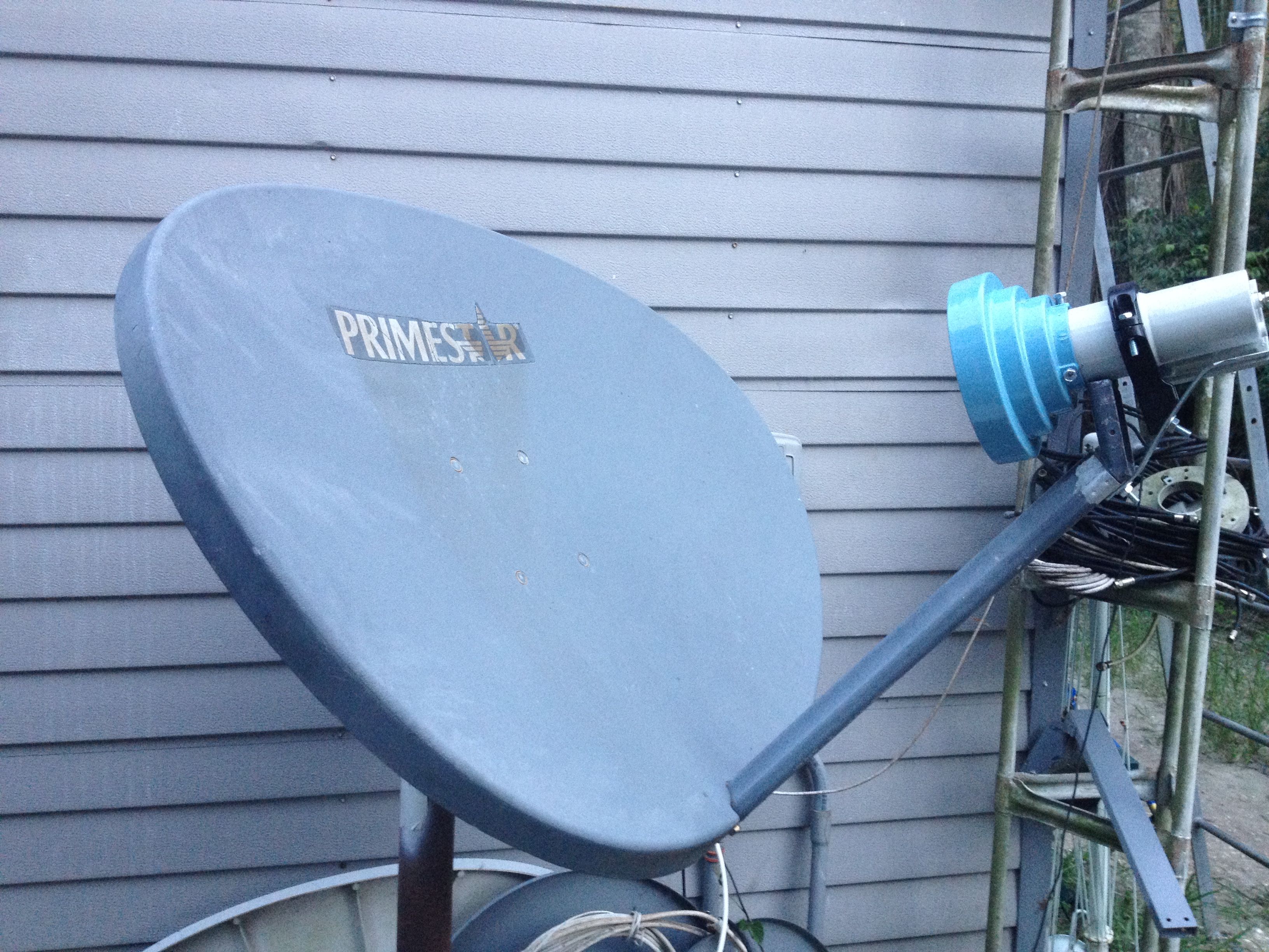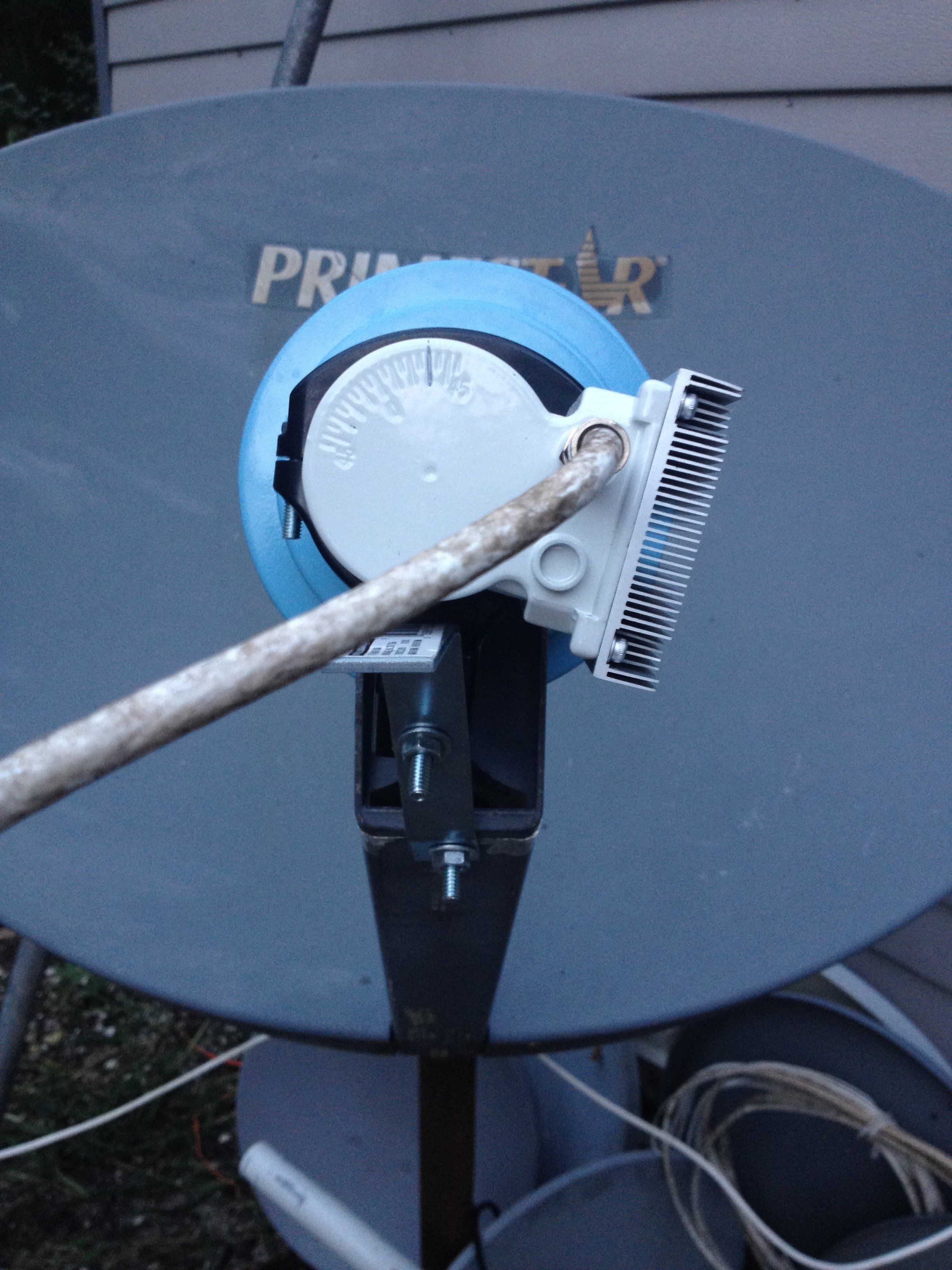 I also retrieved an old 6 or 7ft dish that was lying in the woods for over 10 years, appears to be fiberglass, but it is damaged, has cracks around all the bolts where the mount on the back is, probably due to a tree falling on it during the hurricanes several years ago. Otherwise the dish doesn't look too bad. Has an arm that comes from the center to mount the LNBF on, and appears to still be straight. There is an old Chaparral LNB on there, but it is so corroded I'm sure it's dead, not even going to try. Thinking about removing all the old metal and trying to repair using automotive fiberglass filler, sanding, repainting, and maybe come up with a different way to mount, maybe reinforce the rear damaged area with an old 3 ft dish I have, and build a new mount. Probably just make it stationary just for one sat.