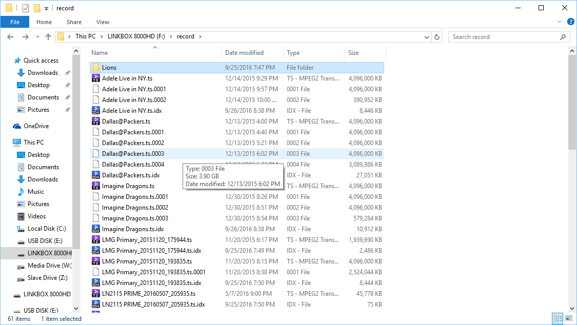 I plugged the hard drive into my computer and here is what the 3500 had done to the file when I renamed the recording. It made a folder called Lions(which is what I was going to rename it) and when I open the folder called "Lions" on my computer it contains the recording, but was not playable from the 3500 when I try to click on Lions. This has never done this before as you can see I've renamed recordings before using the 3500 to rename.