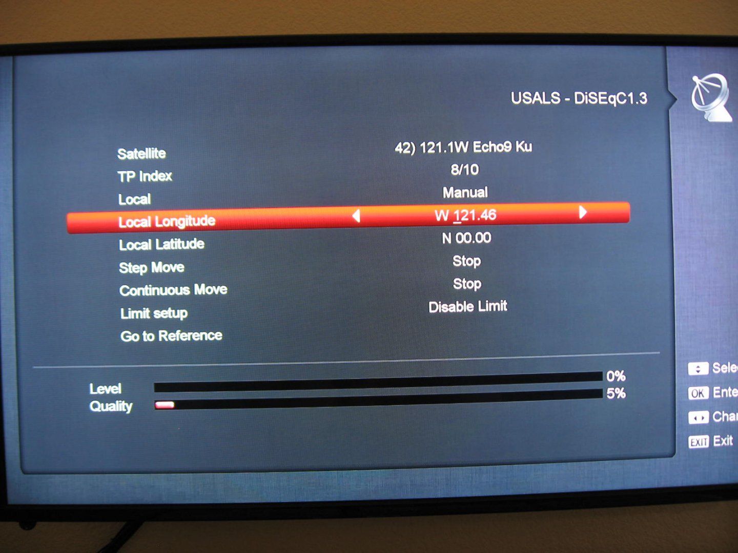USALS only knows to move so many counts from satellite to satellite. So you start by putting the motor at 0 (and leaving it at zero) If you have the dish nearly at the setting I provided all you have to do is slowly move the motor on the pole to dead south till you see on the signal level that you found the satellite. Fine tune left and right till you have the best signal. Now before loosening the adjusting bolts lightly pull back on the bottom of the dish if the signal improves adjust the dish down. If it gets worse adjust up. Now do a blind scan to confirm you are on 121. Now that you are on 121 tighten bolts on the pole and on the dish. I hope you put a through bolt locking the dish to the arm.
