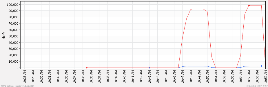 The right most peak is using 3 computers and shows our maximum transfer speed of 98.6 Mbps.