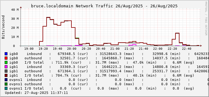 I can see the difference in my bandwidth graphs on my router. The roughly 20-30Mb spike from 19:15-20-05 is us watching Foundation on ATV+, while the subsequent utilization is other services, which included ST: Strange New Worlds on Paramount+ last night: