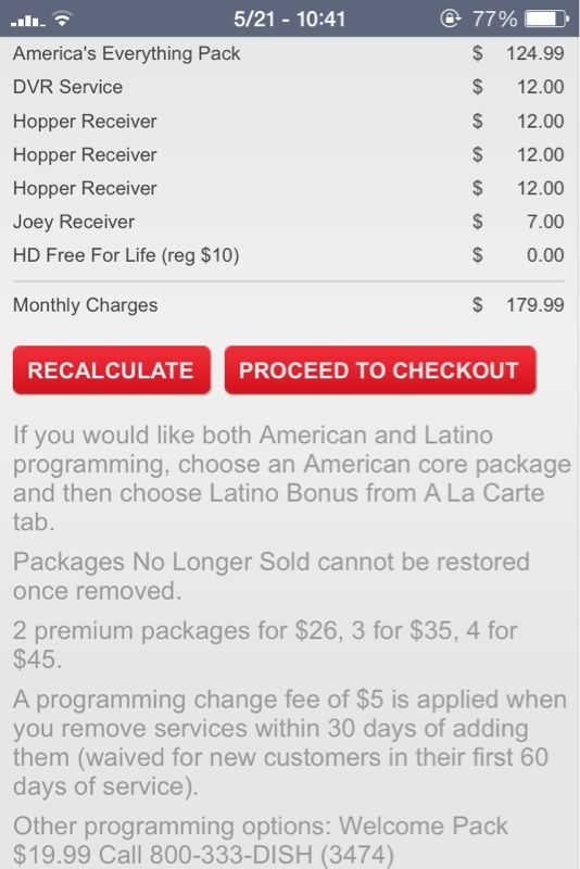 <img src="http://www.satelliteguys.us/attachment.php?attachmentid=97585"/> This is what I have and after tax I pay about 160. I'm getting a lot if programming so I'm not complaining. Posted Via The FREE SatelliteGuys Reader App!