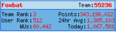 In case anyone was wondering, there have been problems with the F@H Reporting Server for the past 18-20 hours, so EOC has not been updated since Wednesday. I haven't seen any issues with Assignments nor with reporting results, so that's good. Science is still being done.