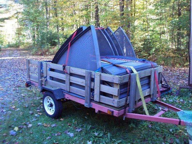 That's two complete Winegard Pinnacles loaded in that 4x8 trailer. They stayed real nice for the whole drive back. There is NO rib frame for these dishes, the panels are such thick metal, and they interlock and bolt together and are self-supporting