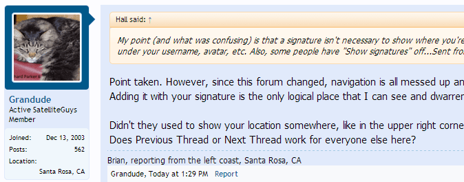 What screen format are you using. When I look at the same post, his location does not show up under his avatar.Without looking at your signature, I can see that your location is Santa Rosa CA