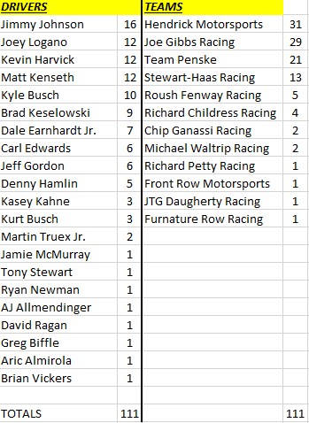 There have been a total of 111 Sprint Cup points races run from the 2013 Daytona 500 to last week.