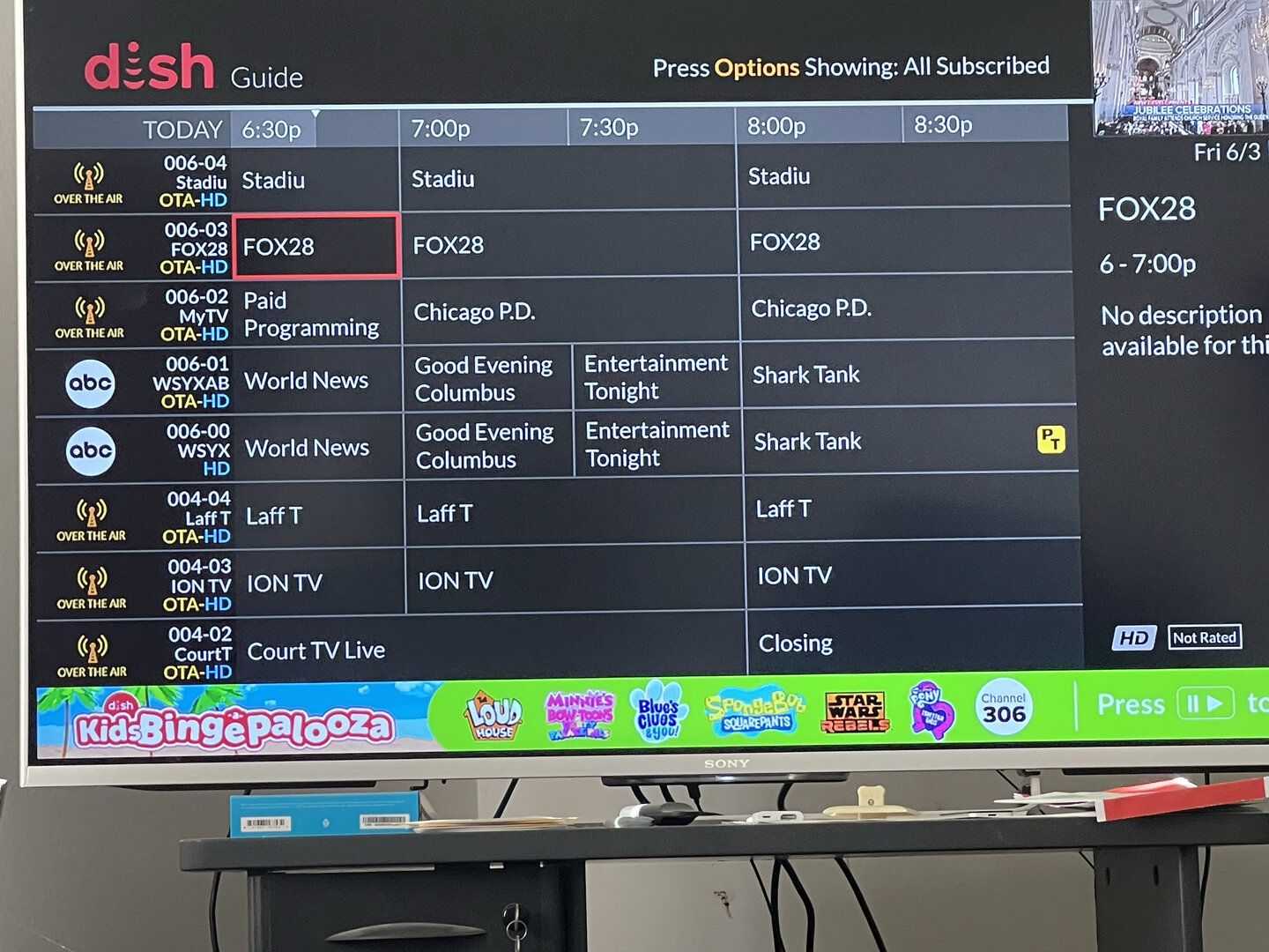 Img765 shows that Dish themselves do recognize that Fox is now on 6-03, since they replaced the feed they use for channel 28 with the 6-03 feed, and labeled it WSYX3. However, the guide mapping is still wrong. So, the department that handles local channel carriage on satellite, and the department that handles OTA guide information mapping, evidently do not communicate with each other.