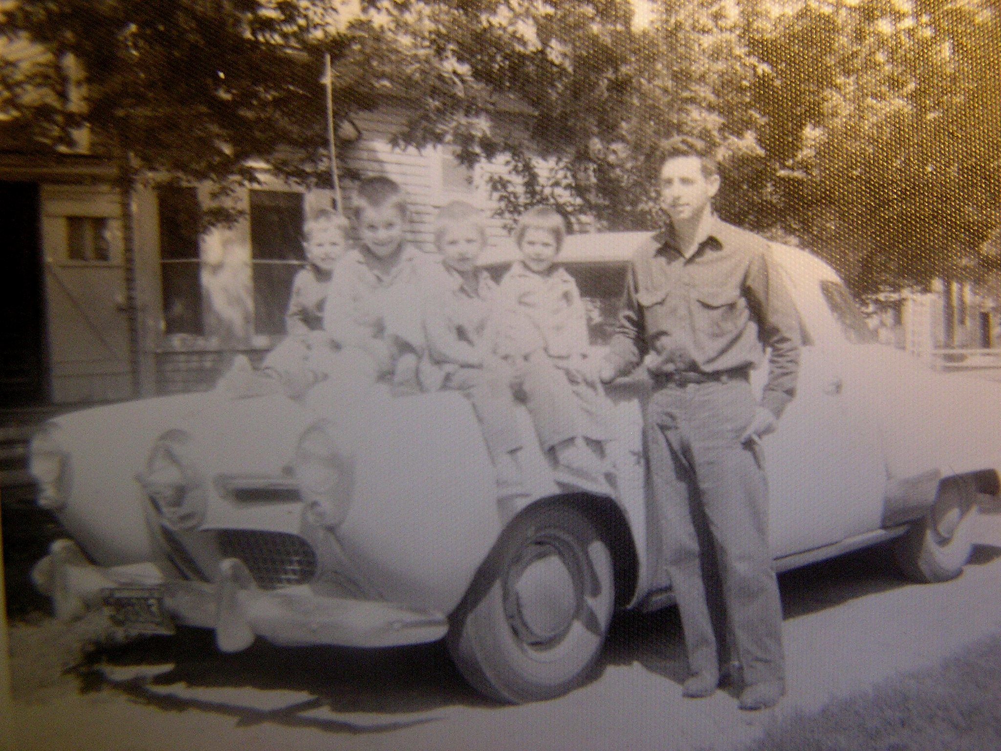 Here is the old yellow Studabaker with us kids on the hood. Little sister is positioned next to dad, then two older brothers and finally yours truly. v12.jpg
