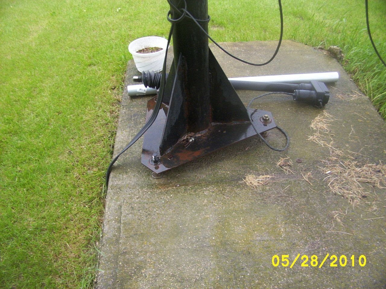 Dish did not include a pole. I am temporarily using one from a 6' solid dish from Sadoun that I will put up at some point in the future once I get a better pole in the ground for the 8' mesh. The concrete pad used to be the foundation for a small shed that was torn down before we bought our house. The pole mounts with three concrete anchors plus there a three bracing rods that extend from the pole. Pad isn't quite level but I was able plumb the pole by adjusting the nuts on each concrete anchor while using a magnetic inclinometer.Looks good. Was the pole included? (just wondering) looks like a floating slab type 'base' - is there a 'way' to plumb the pole if the slab shifts?