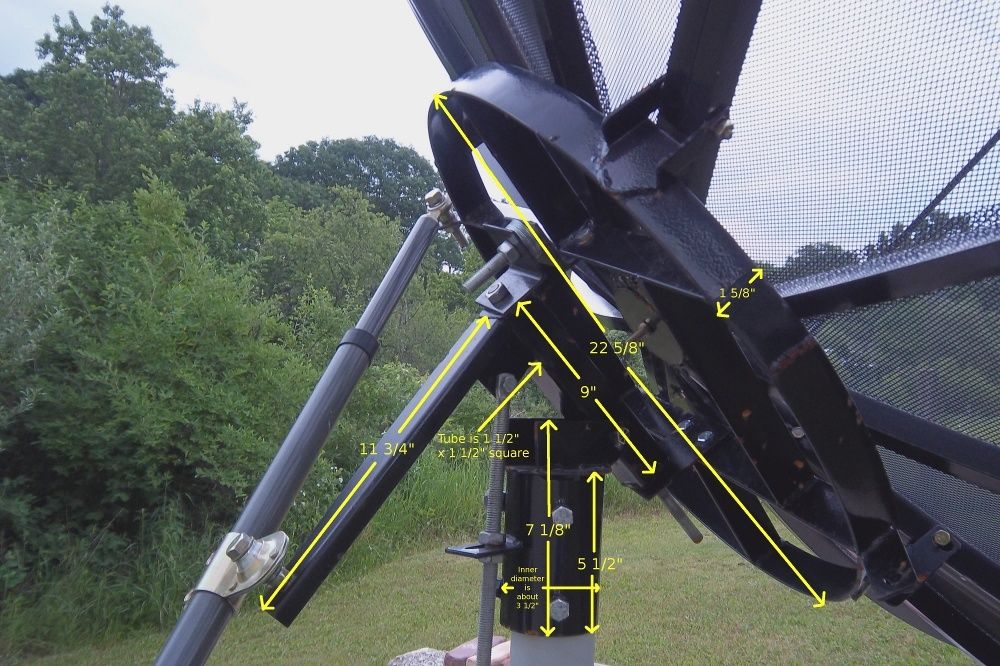 Here are some measurements I took of the dish and mount. Being aluminum, the dish is really light but I still think the mount could be improved.