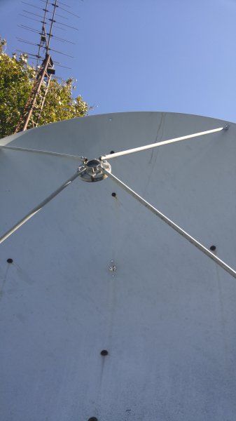 is 70mm I think. So it should fit nicely inside the feed bore of the Andrew scalar.So the plan is to paint the polar mount with grey rust paint. Its a reddish brown color now. Also the reflector will get a good cleaning then on a pole she goes