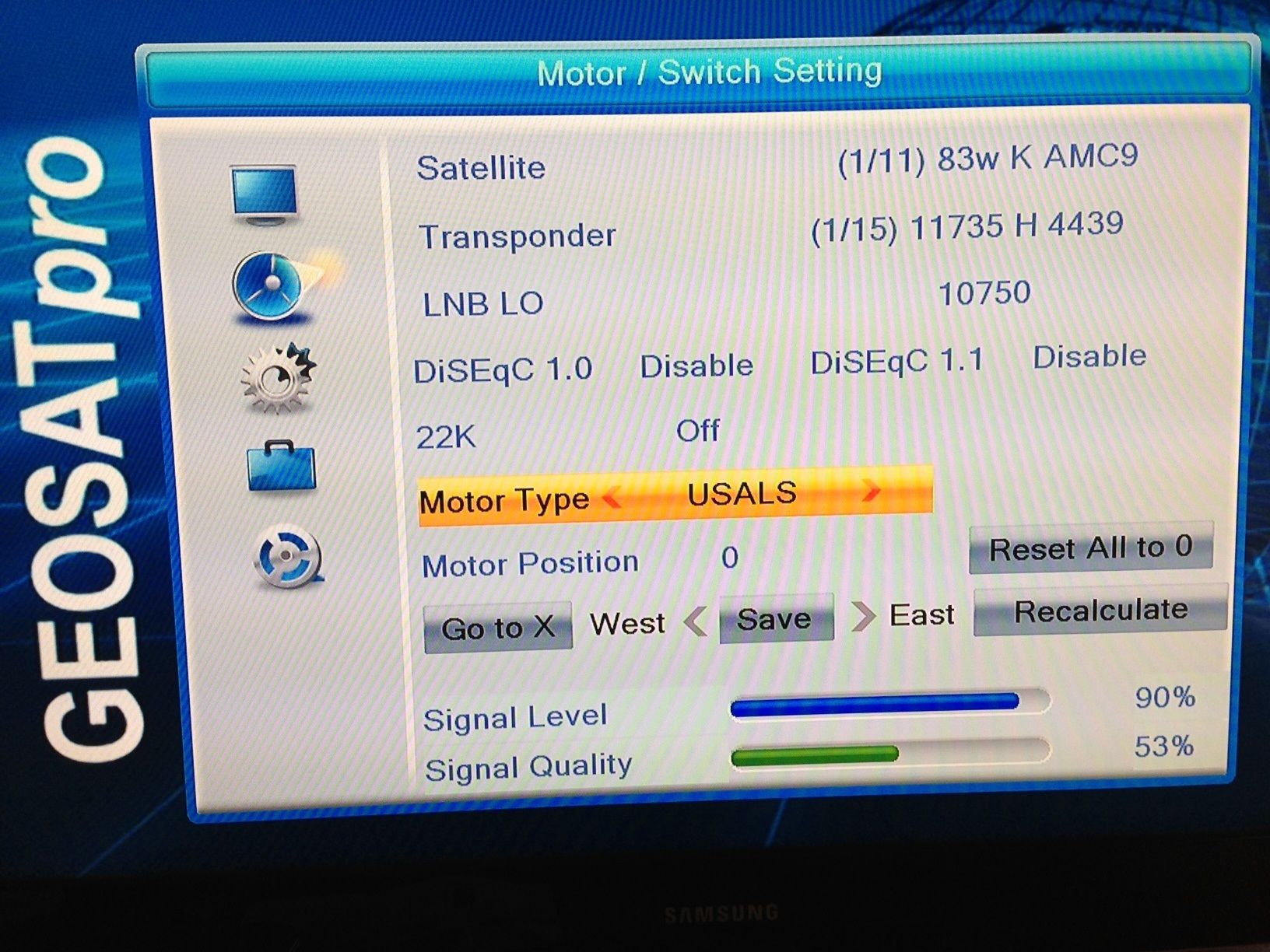 Once the satelliote is scanned, set-up for another satellite maybe try 97w KU G19, activate USALS and the motor will automatically drive to the calculated position. Verify the signal is optimized on a few transponders (11842, 12152, 12177) then scan in channels.