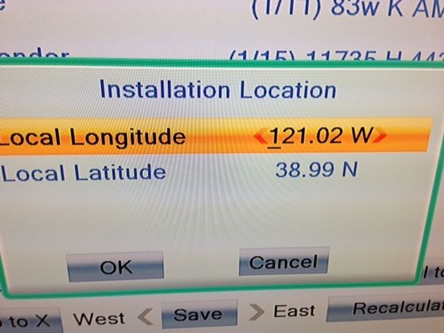 2. When USALS is highlighted, Press List/OK button to display the Installation Location. HAve you entered your Longitide (West) and Latitude (North) into this screen?