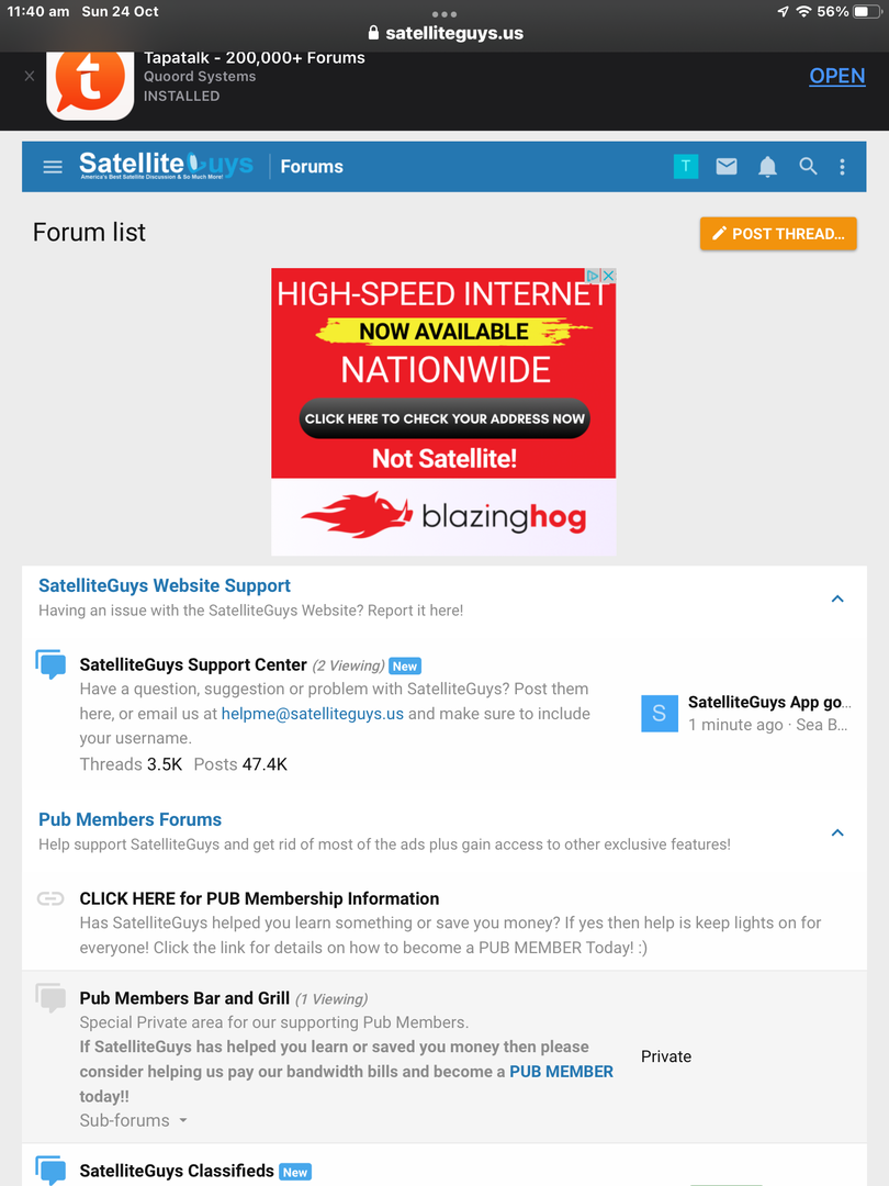 Have you tried to install the SatGuys app that is available from the SatGuys site? I don't get any old threads or ads using it. Here is how I install the SateGuys app. I am using an Android phone Chrome browser. Go to the Chrome browser. Type in SatelliteGuy.US site. When it opens click on the browser settings upper right corner, NOT the SateGuys settings. When the menu opens select Install app. The SateGuys app will install on your cell phone home screen.When I upgraded from an iPhone 8+ to an IPhone 12 Pro Max I lost the SatelliteGuys app. I tried Safari but it was horrible. I then Downloaded the Tapatalk app. Scott is correct. The Tapatalk app works just like the SatelliteGuys app. The Tapatalk ads seem to only affect the beginning. Once you are viewing the SatelliteGuys site i stop seeing the ads. For me the Tapatalk app is a clear winner.