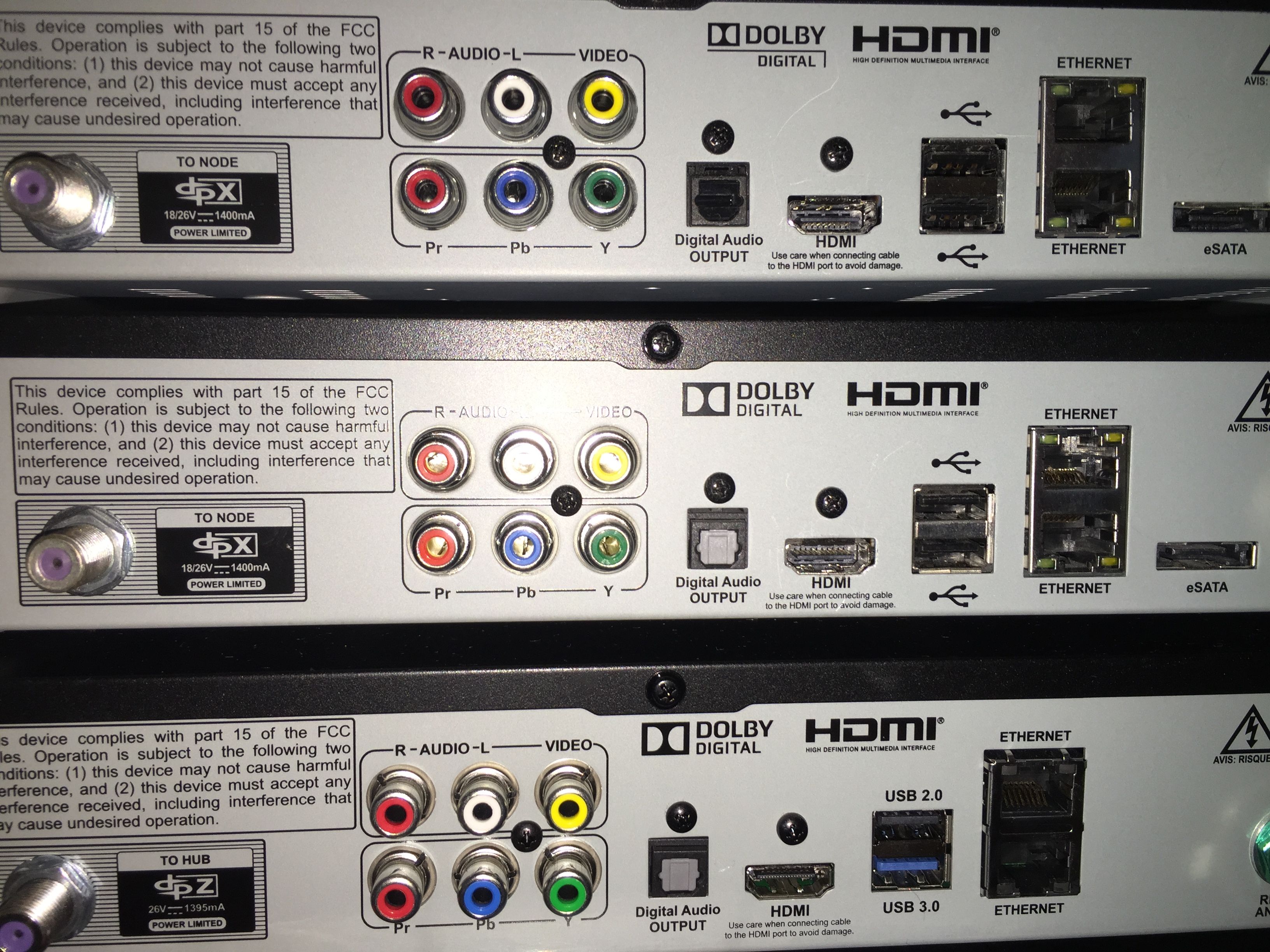 I have a Hopper with Sling and 1 Joey. I installed a new Onkyo receiver and need to connect the red/white RCA cable from the Onkyo to the Audio Output on the Hopper. But the Audio/Video outlets are connected to a powered box and the output of the box is coax connected to my Joey in the bedroom. Does the Hopper 3 have a coax hub that will free up the Audio/Video outlet?Here from top to Bottom are the Hopper 1, Hopper with Sling and Hopper 3.