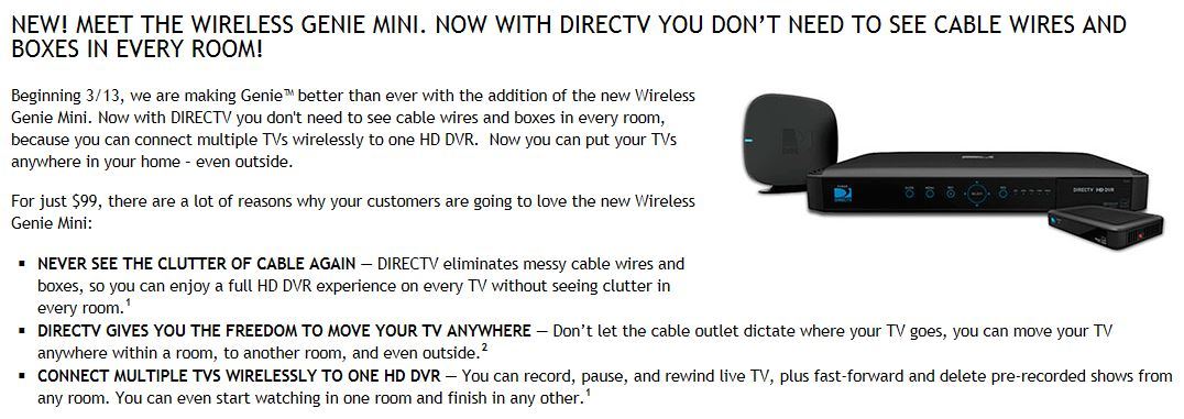 That's a good question. I'm assuming the $99 is an upgrade fee for the wireless client(s). This c/p makes me think the upgrade fee covers 3 of them: 1 Requires a Wireless Genie Mini for each additional TV or a DIRECTV Ready TV. Limit 3 remote viewings per Genie HD DVR at a time.