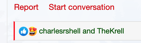 So, in this post you put up, does this mean charlesrshell Liked and The Krell Loved ?I posted a screen clip below of the reactions to post #541 here. So you are seeing text instead of icons?