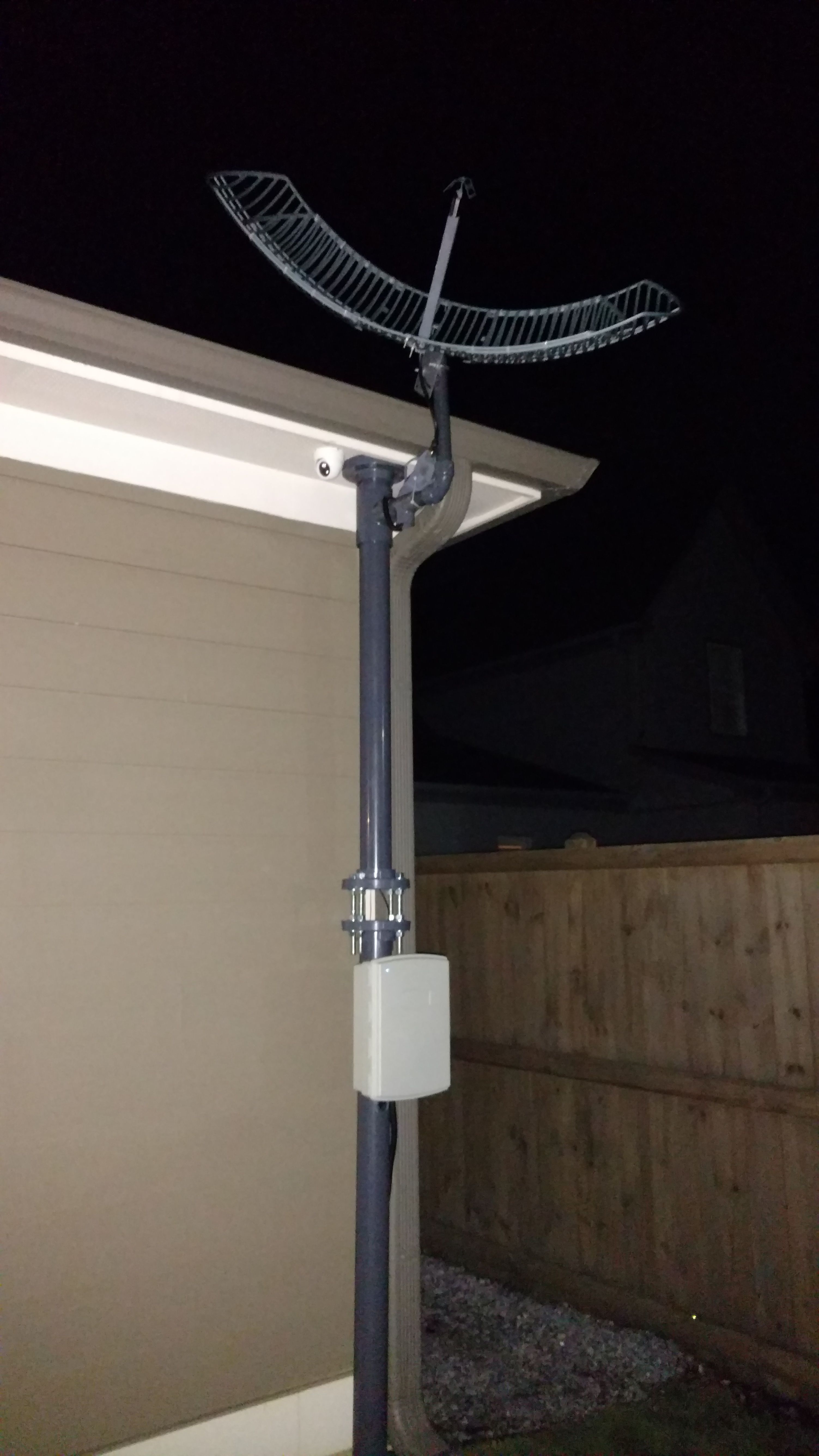 Please ignore the mount. This is a temporary setup just for comparison. So I used some PVC I had on hand. I wouldn't recommend a PVC mount for a permanent install but it'll serve my needs for a couple of weeks. I want to see how the grid antenna compares during rough weather. So far though, it works darn well for EMWIN. Once I get the LRIT demodulator, I'll see how it performs on the grid antenna vs 1.2m dish as well.