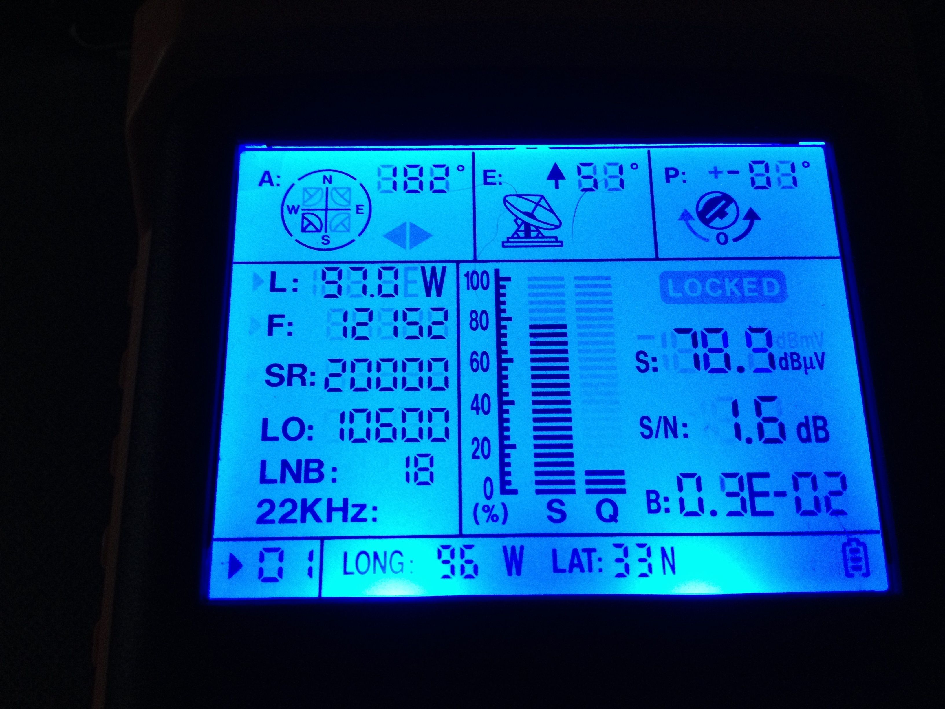 Another confusing thing is that my meter is picking up Galaxy 19 but it says it's on 95W. I know that's just a relative number but the other settings are more like C band freqs. I'll post a screen shot of it tonight when I get home from work. It's really strange to me.