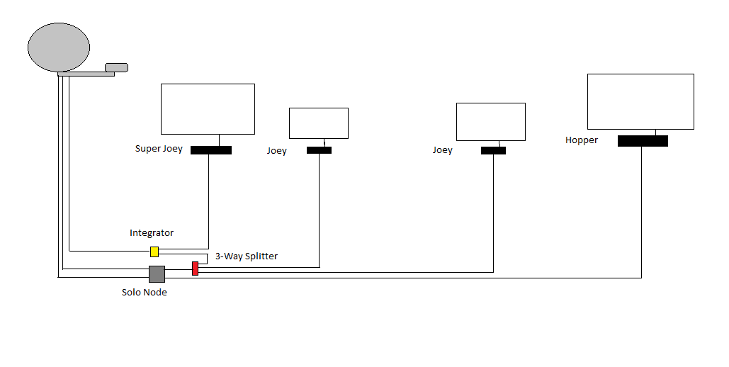 OK,here is a possible "unsupported" wiring set-up scenario for 2 Hoppers,1 or 2 Super Joey's,& a duo node ready to be shot down,since we know that the Super Joey needs a third line from the LNB to run through the integrator,but the duo node also needs all 3 lines from the LNB connected to it,why wouldn't "theoretically" placing a 2-way splitter(3-way if you are going with 2 Super Joeys) on the 3rd line to run 1 line to the integrator & the other line to the duo node(with a 3-way splitter,run a line to each integrator & to the duo node) not work? Because you know that there is going to be one brave,adventurous soul out there who is going to try.