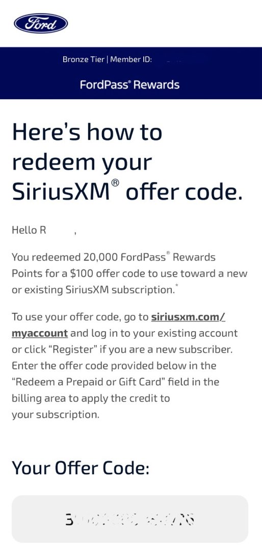 Hope I remember about this come Feb '26That's basically what I did. When you redeem your FordPass points, you get an email sent to you with a code you use on your SiriusXM account.