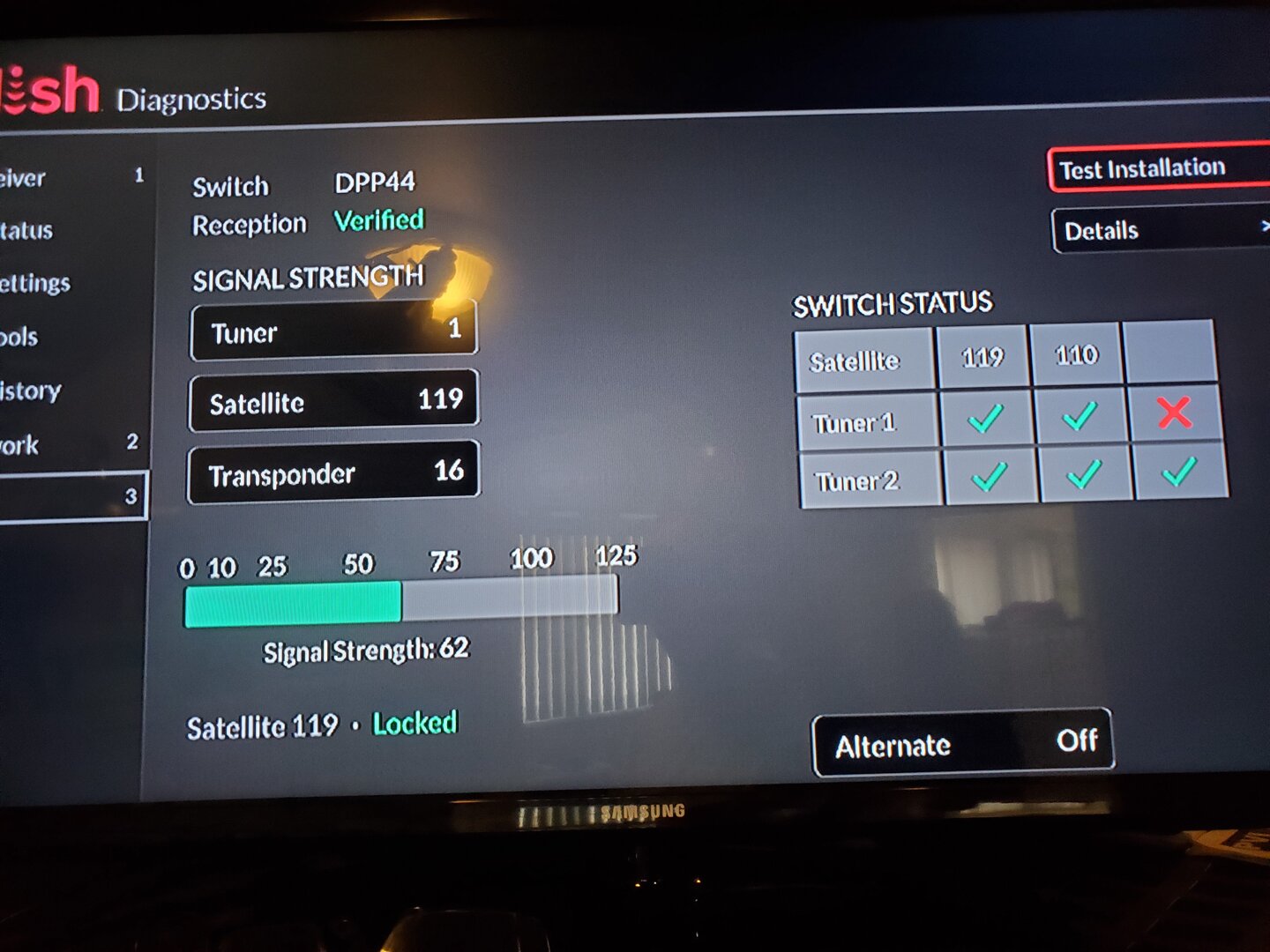 Yesterday I came up with a work around that might have worked or might have been a coincidence. But after it had been searching for 129 for 15 minutes or so, I went and stood in front of the dish. Within 30 seconds of blocking the signal, it moved on to the next step which is a message warning that it isn't seeing all the satellites (even though it is seeing 110 & 119). You select "Watch Tv" and everything is fine. (As I stood in front of the dish, it stopped moving.)