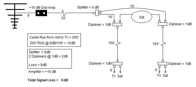 Another question then arises. If the amplifier is located 6' from the antenna then you are definitely using it outside. Is the distribution amp outdoor rated and can you safely run power to it without the risk of electrocution? Probably not. If this is a plug in distribution amp then we are talking about 120 volts of AC power sitting on the antenna mast. It would be safer to install a mast mounted preamp such as this http://www.solidsignal.com/pview.asp?mc=03&p=CM-7777&d=Channel-Master-Titan2-TV-Antenna-Preamp-w-Power-Supply(CM7777)&c=Pre-Amplifiers&sku=02057207774. It's injector is usually plugged in safely inside your home but since the antenna feed needs to move on to the satellite dish that's not likely possible. You could place the power injector just before the splitter if there is a weather protected GFCI outlet available nearby.