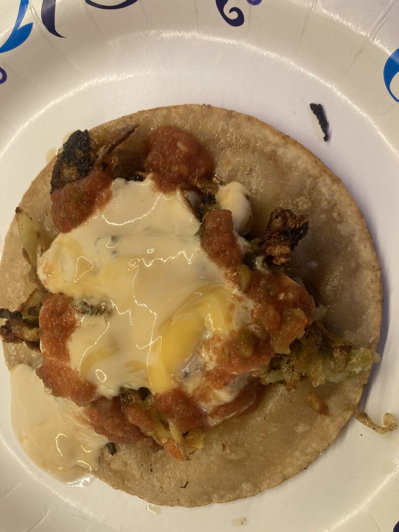 Chorizo, hash browns and egg stuffed into a large sopapilla and smothered with green chile sauce and shredded cheddar. Coffee. :biggrin