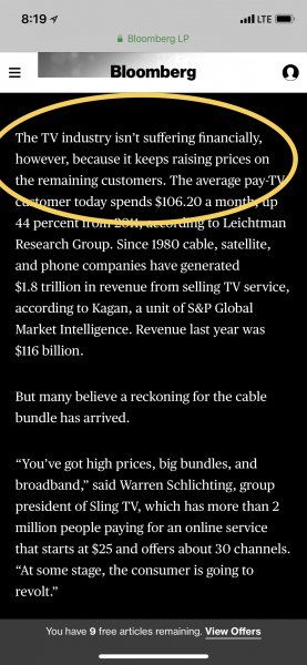 This is the reason so many are cord cutting. Now over 50 million that have streaming devices. There are so many choices, the cable/satellite sub does not have.