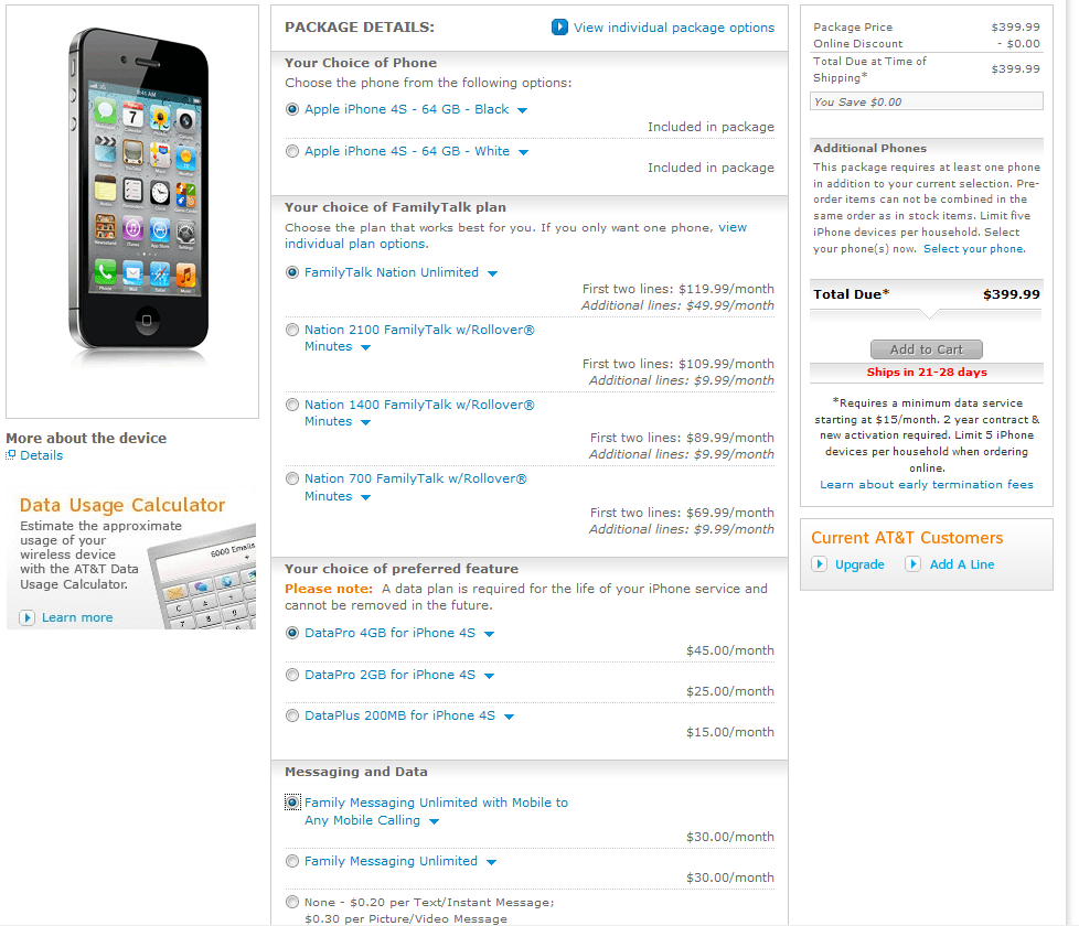 "DataPro 4 GB is required for use of Internet Tethering or Personal Hotspot. Internet Tethering over Bluetooth or USB requires iOS 4.0 and iPhone 3G, iPhone 3GS, or iPhone 4. Personal Hotspot over Wi-Fi requires iOS 4.3 and iPhone 4 ."